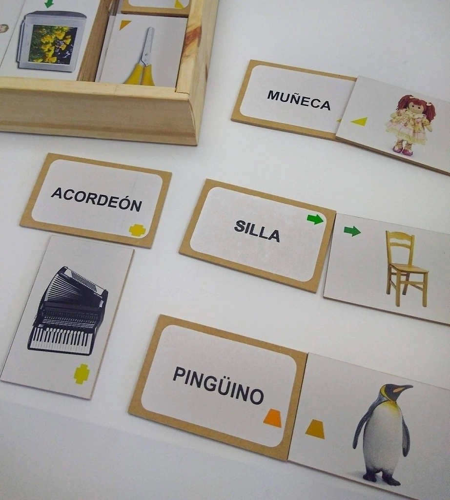 Autodictado: 48 imágenes reales con sus 48 palabras asociadas y biñeta de autocorrección. Fichas 9,5 x 6 cm. Caja: 28.5 x 22.5 x 5.5cm Todo madera